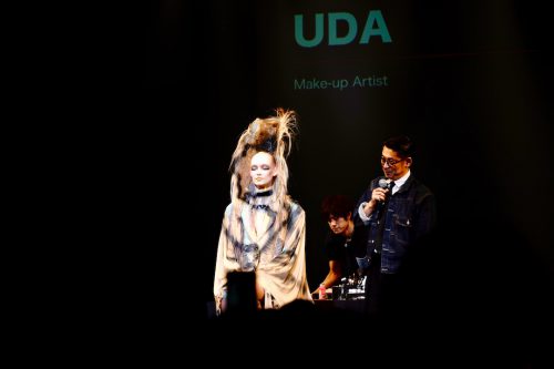 続いて、プロのアーティストのステージが行われ、シュウ・ウエムラの数少ないアトリエ・アーティストとして活躍されている木村 淳一郎氏とメイクアップアーティストUDA氏のデモンストレーションが行われました。